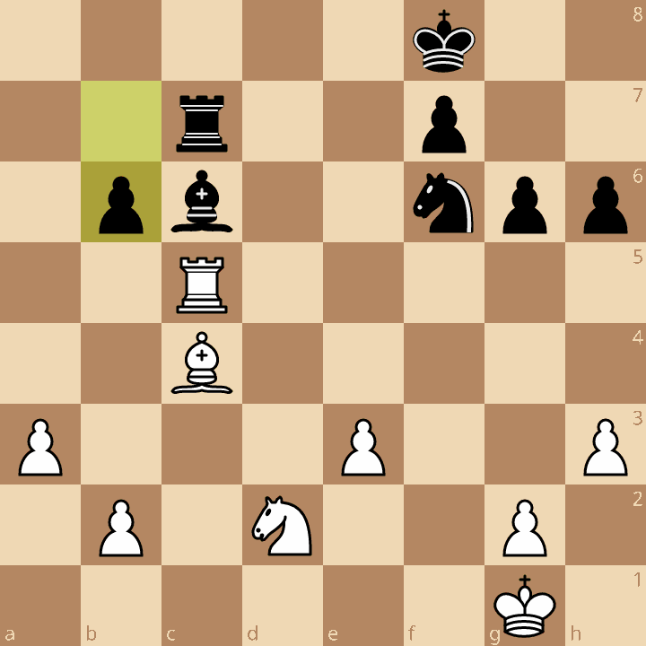 Black is more comfortable in this position, thanks to her better pawn structure; but otherwise the material balance and mutual potential passed pawns (White’s a-pawn, Black’s c-pawn) means that this position should be holdable for White, provided she finds the right plan. Her first priority should be freeing her rook.