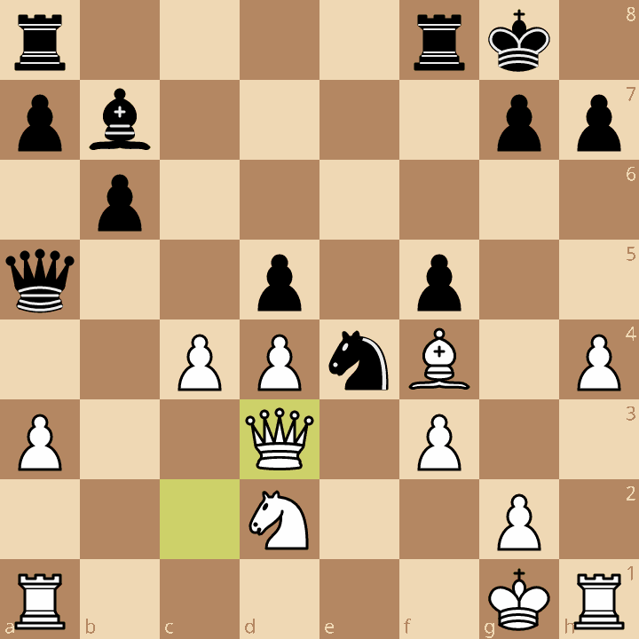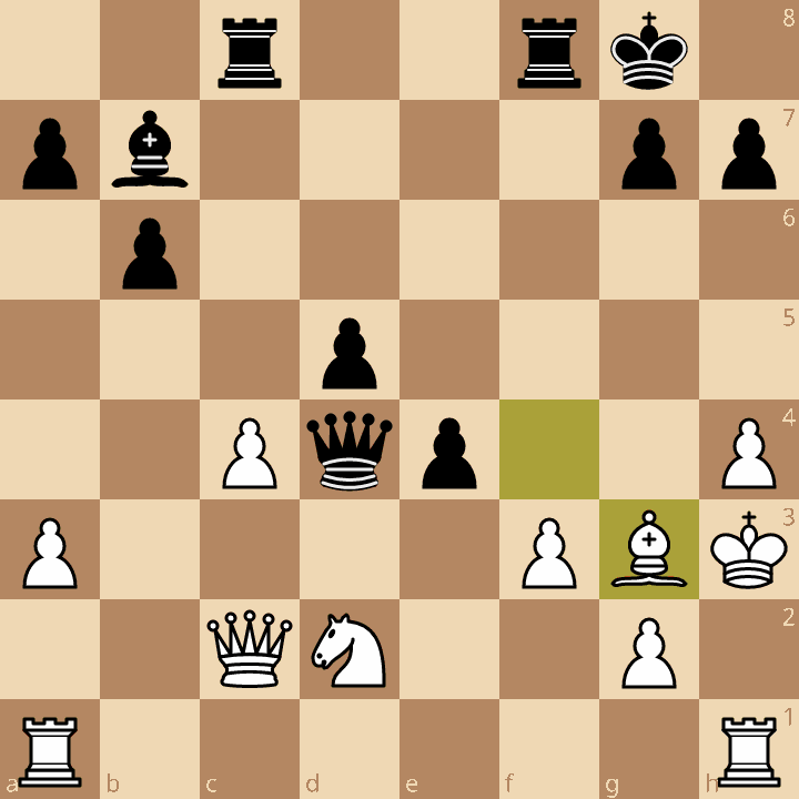 Here Divya played the move 15…Be5, making a threat on the b-pawn. Lagno decided to defend it with 16.Qb3, but she had a much better idea available: