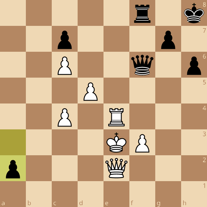 White’s queen is overloaded and must give up her rook to stop the pawn (58.Qxa2 Qc3+! 59.Ke2 Qxf3+ 60.Kd2 Qxe4) , so she resigned.