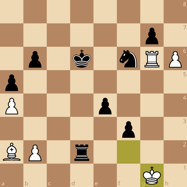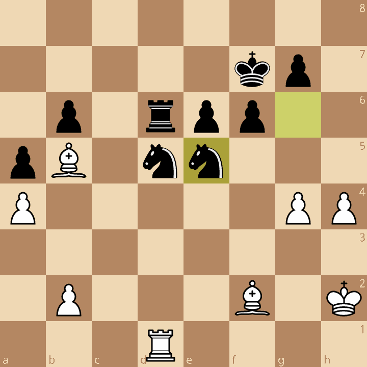 White has a tough trial ahead, because of the connected and passed e6-pawn. Her light square bishop doesn’t seem to do much for the position, and the advanced g- and h-pawns are also looking a bit weak. Her only consolation at the moment is that her rook x-rays Black’s which as of yet has no defender, thus pinning the knight on d5. The game was in within drawing bounds from here, but the weakness of the kingside pawns painted big target signposts on them and Zhu found a way to destroy the g-pawn and make her f-pawn passed as well. Later in this endgame, Zhu danced her knights around White’s position with the coordination of the passed e- and f-pawns to get here: