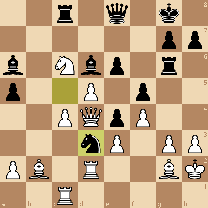 Divya’s knight has found some juicy targets: the c1-rook and b2-bishop. The DSB would be great trade, because then White has no pressure on the g7 square. And of course, an exchange of knight for rook isn’t bad either. However, this idea is tactically flawed, and the shakiness in her position is about to be completely exposed.