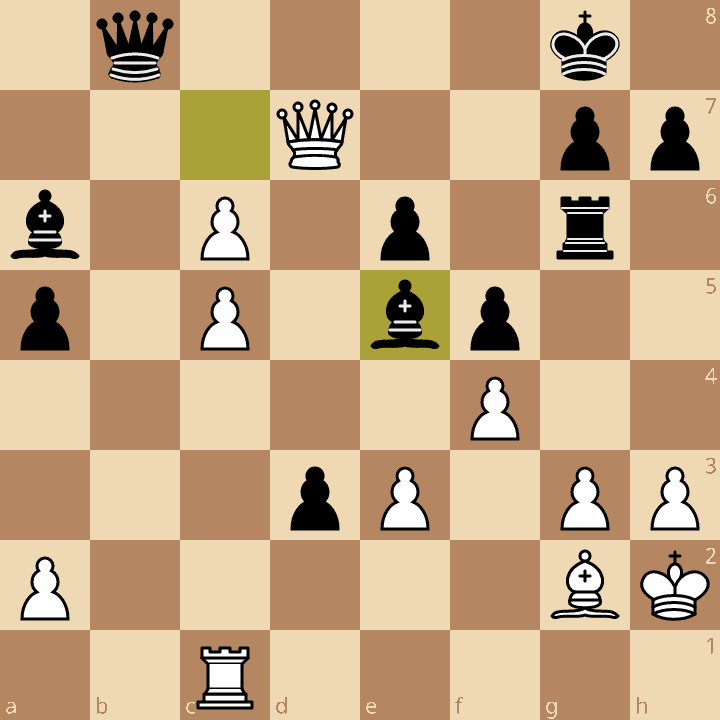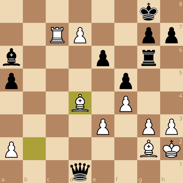 White can even allow Black their queen first. 30…d1=Q 31.Bd4! This interference tactic seals the win. Black has no meaningful threats, the d-pawn is going to queen, and escape attempts by Black run into problems on the h-file, the f8-square, and the 7th and 8th ranks.