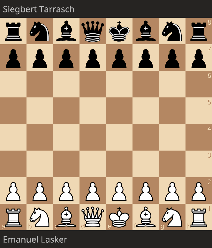 Tarrasch is the representative of a very refined form of Steinitz’z modern school of chess. He’s dogmatic and brash. He favors classical development: Knights before bishops, castle early, send a pawn into the center right away, and hold on to it as long as possible! He values openings that aggressively fight for equality, and therefore, 1.e4 e5 is almost obligatory, and we also know of his variation in the Queen’s Gambit Declined, where after 1.d4 d5 2.c4 e6 3.Nc3, Black doesn’t settle for less space and instead immediately breaks with 3…c5! Tarrasch is inflexible, and boring. He doesn’t have a deep conception of the game. But he’s generally safe to recommend to amateurs looking for advice.