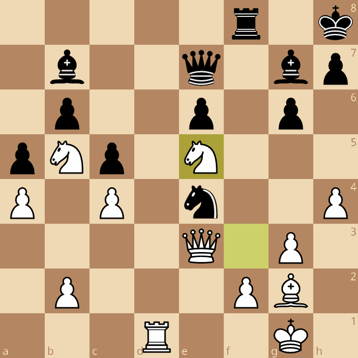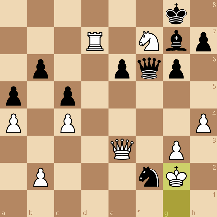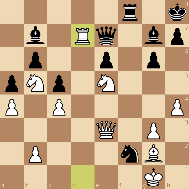 Low in time, Divya misses the critical continuation, and it’s just back to equality. Instead, 27.Nd6! was necessary — but it’s hard to find this in the middle of a game that isn’t close to ending. 27…Bxg2 28.Ndf7! Kg8 (28…Rxf7 29.Rxf7 Qxe5 30.Rf8+! Bxf8 31.Qxe5+) 29.Nh6+ Kh8 30.Nef7+ Rxf7+ 31.Nxf7+ Kg8 32.Kxg2; the dust is settling and White is up a piece and completely winning. There are other winning continuations but this is the most straightforward one to me.