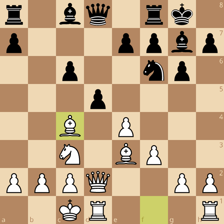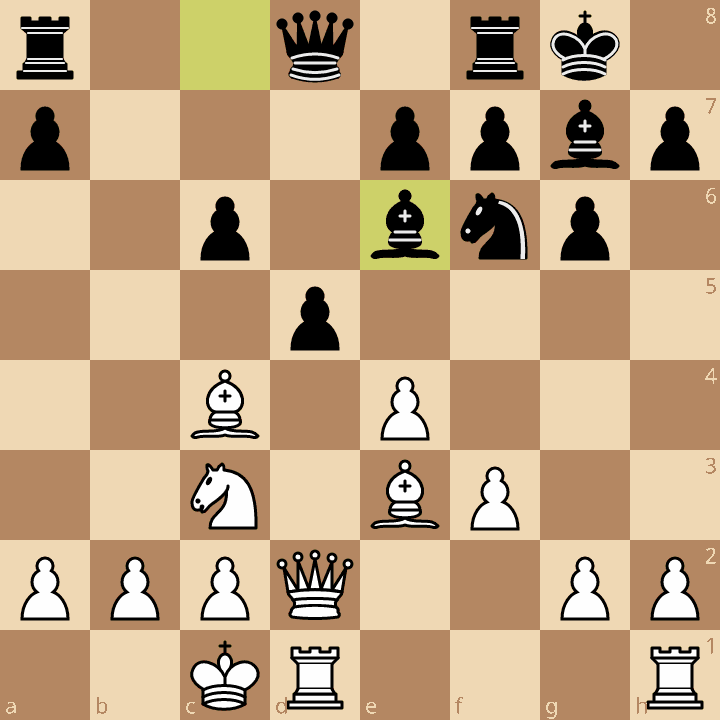 White has just played Bc4. The bishop is obviously verboten due to dxc4?? Qxd8! Rxd8 Rxd8+ and Black down the exchange with back rank problems. On move 11, Kateryna spent about 30 minutes thinking of what to do, because White is threatening to chop on d5 and win a pawn. I think there is really only one option to prevent this: 11…e6; the other idea would be to go very active with Rb8, sacrificing a pawn in the process. The problem with e6 is psychological — Black would usually want their bishop to have access to e6 and not block it in with this pawn; it takes more time to get this bishop via the move a5 and Ba6, or Black could play Bb7, which would give it a strange impression. In any case, neither of these options were to Lagno’s liking, and she finally chose her next move: