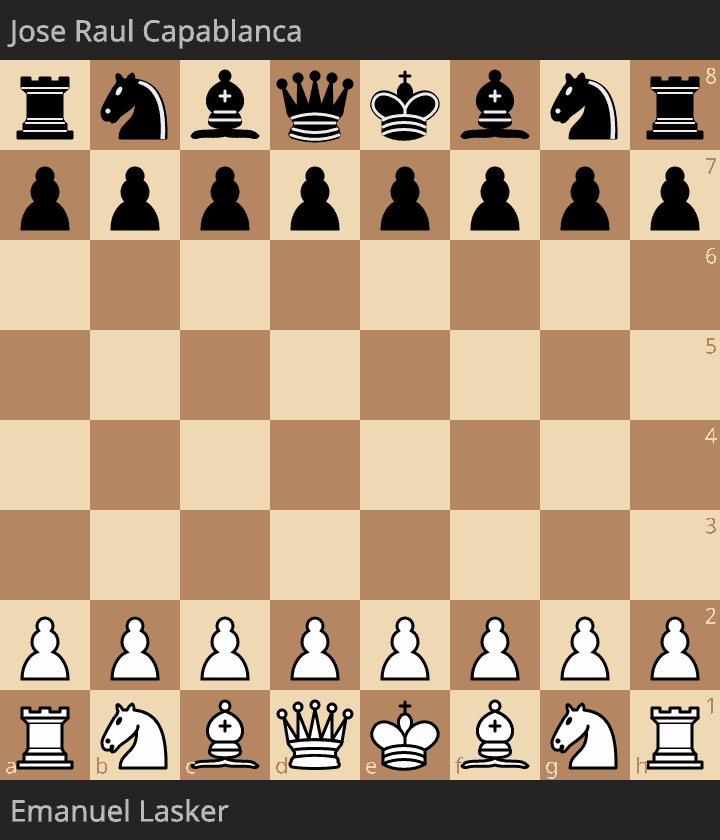 The Ruy Lopez opening was Lasker’s usual weapon in the open game. Lasker often played down the very main line if given the opportunity: 1.e4 e5 2.Nf3 Nc6 3.Bb5 a6 4.Ba4 Nf6 5.O-O Be7 6.Re1 b5 7.Bb3 d6 8.c3