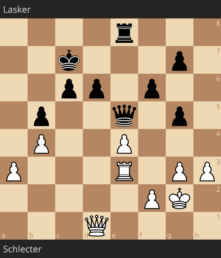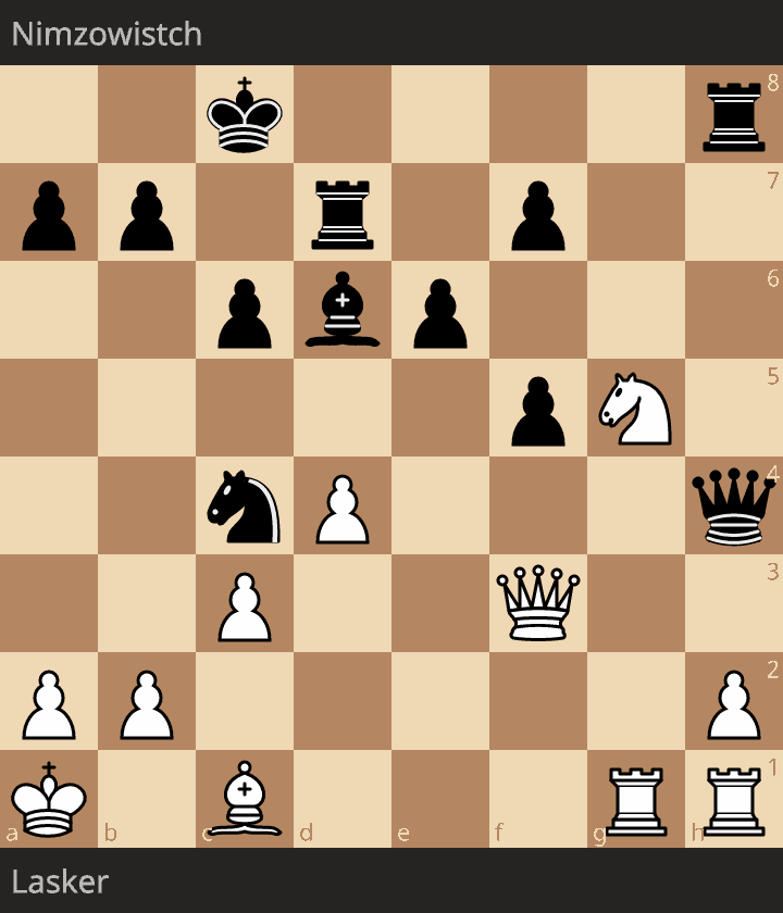 Counterplay Finder: Sometimes Lasker is saddled with the unfortunate label “psychological” when people try to describe his play. What they meant was that Lasker would intentionally make bad moves to trick his opponents into lost positions; in other words he was a glorified swindler. Whether as admiration like Reti or detraction like Fischer, they were wrong and Lasker’s play has stood the test of time. Modern analysis shows that Lasker was one of the best and most correct of his era, especially when it came to finding ways to set problems toward his opponents. Nowadays, we just call this “counterplay”. The moves Lasker chose were based on his fine-tuned assessment of the positions. Lasker shows, more than any other player of his era except possibly Capablanca or Alekhine, how you can find resources in positions to stay alive or even turn the entire game around.